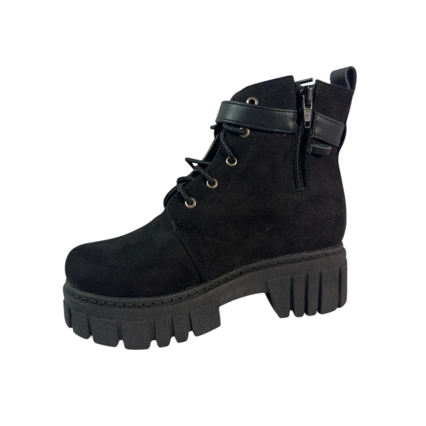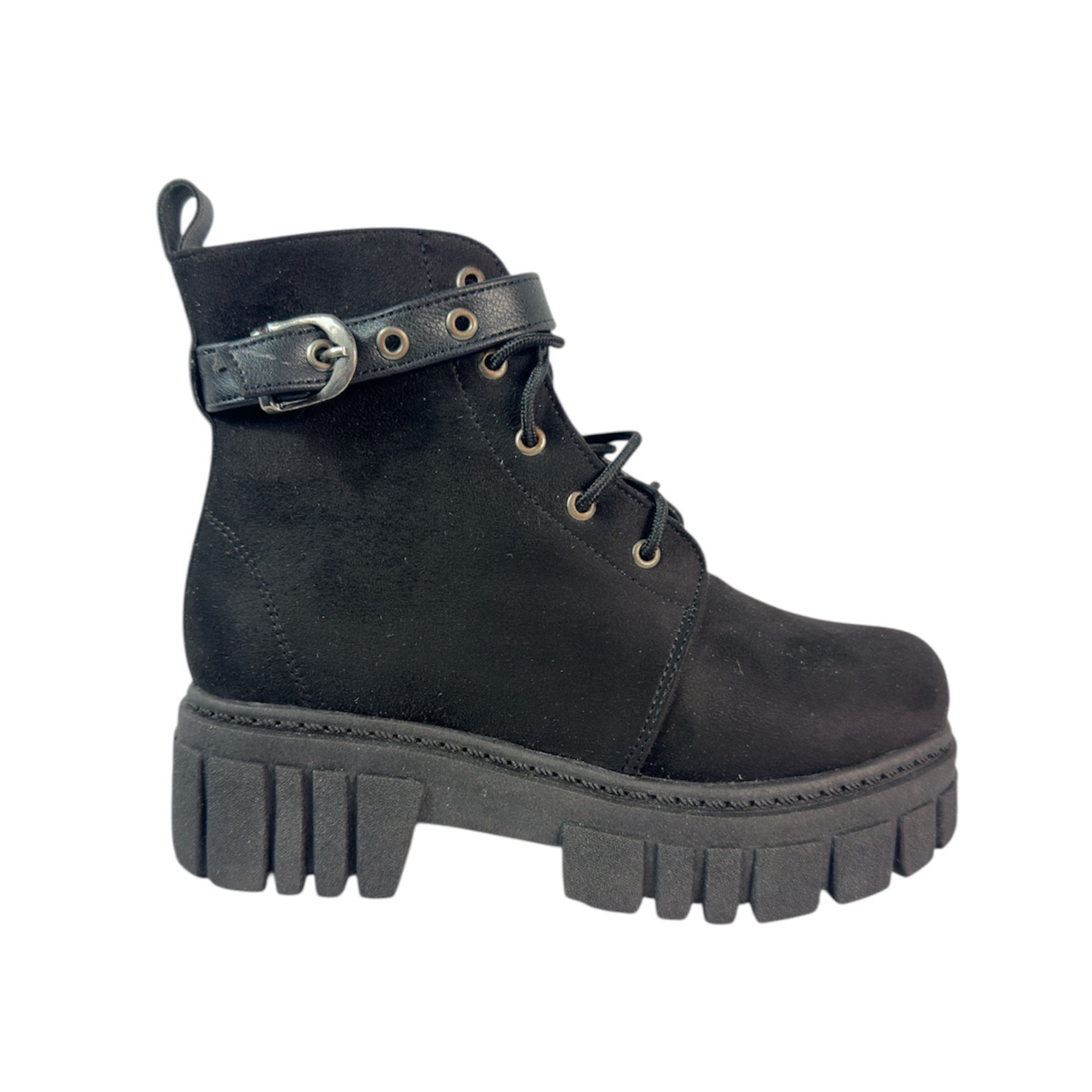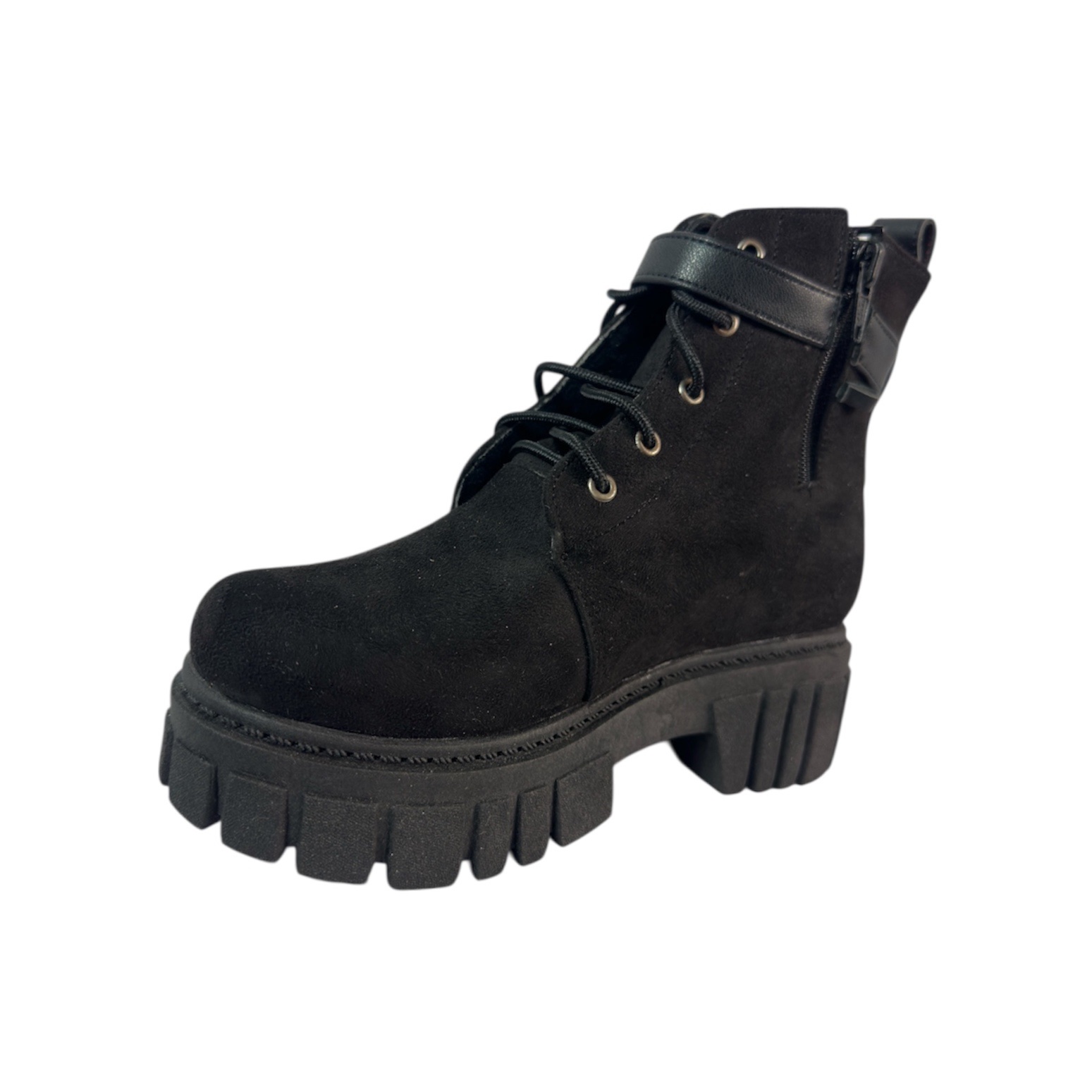 Dale un giro a tu estilo diario con el Botín Belt Black. Este modelo destaca por su diseño de inspiración militar con un toque sofisticado, ideal para quienes no tienen miedo de marcar tendencia. Su acabado en textura tipo gamuza (Suede) le otorga una suavidad visual que contrasta perfectamente con su imponente suela.